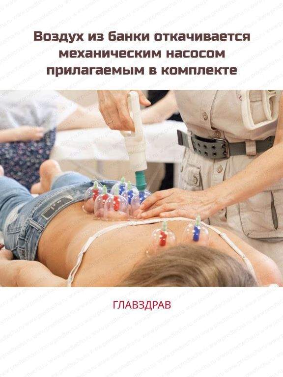 · Комплектация: вакуумные банки пластиковые класс С (повышенной прочности) 24 штуки: d65мм - 4 шт, d60мм - 14 шт, d40мм - 2 шт, d40мм - 1шт,d30мм - 2 шт, d30мм анатомическая 1 шт, механический насос с шлангом удлинителем для самопостановки, набор запасных клапанов 2 шт, магниты к банкам съемные: 10шт синие, 10шт красные, 2 силиконовые смягчающие насадки на банки + СКРЕБОК ГУАША. Инструкция на русском языке.