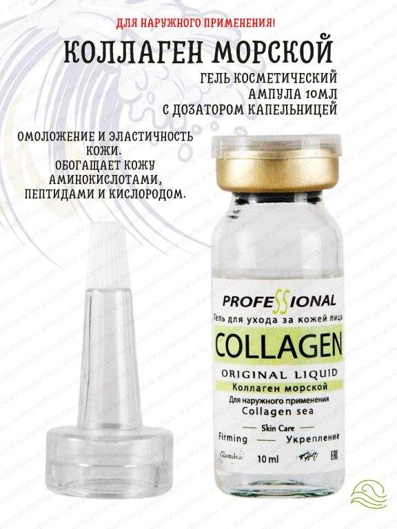 Морской коллаген эффективное омоложение кожи, улучшающий эластичность кожи. Замедляет процессы старения. Способствует образованию собственного коллагена и восстанавливает его структуру. Обогащает кожу аминокислотами, пептидами и кислородом. Тонизирует кожу после массажа лица. Защищает кожу от агрессивного действия окружающей среды (солнце, ветер, вода). Увеличивает действие других компонентов, входящих в состав косметических средств.