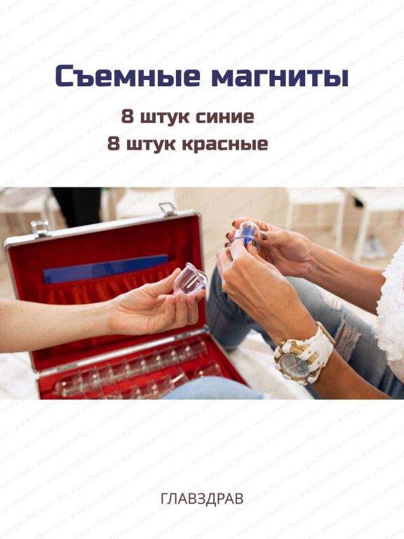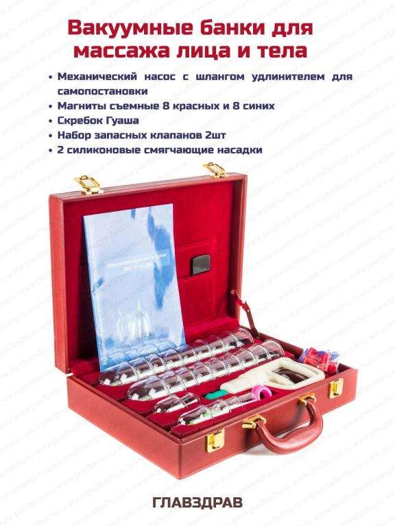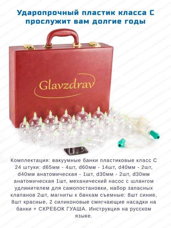 · Комплектация: вакуумные банки пластиковые класс С (повышенной прочности) 24 штуки: d65мм - 4 шт, d60мм - 14 шт, d40мм - 2 шт, d40мм - 1шт,d30мм - 2 шт, d30мм анатомическая 1 шт, механический насос с шлангом удлинителем для самопостановки, набор запасных клапанов 2 шт, магниты к банкам съемные: 10шт синие, 10шт красные, 2 силиконовые смягчающие насадки на банки + СКРЕБОК ГУАША. Инструкция на русском языке.